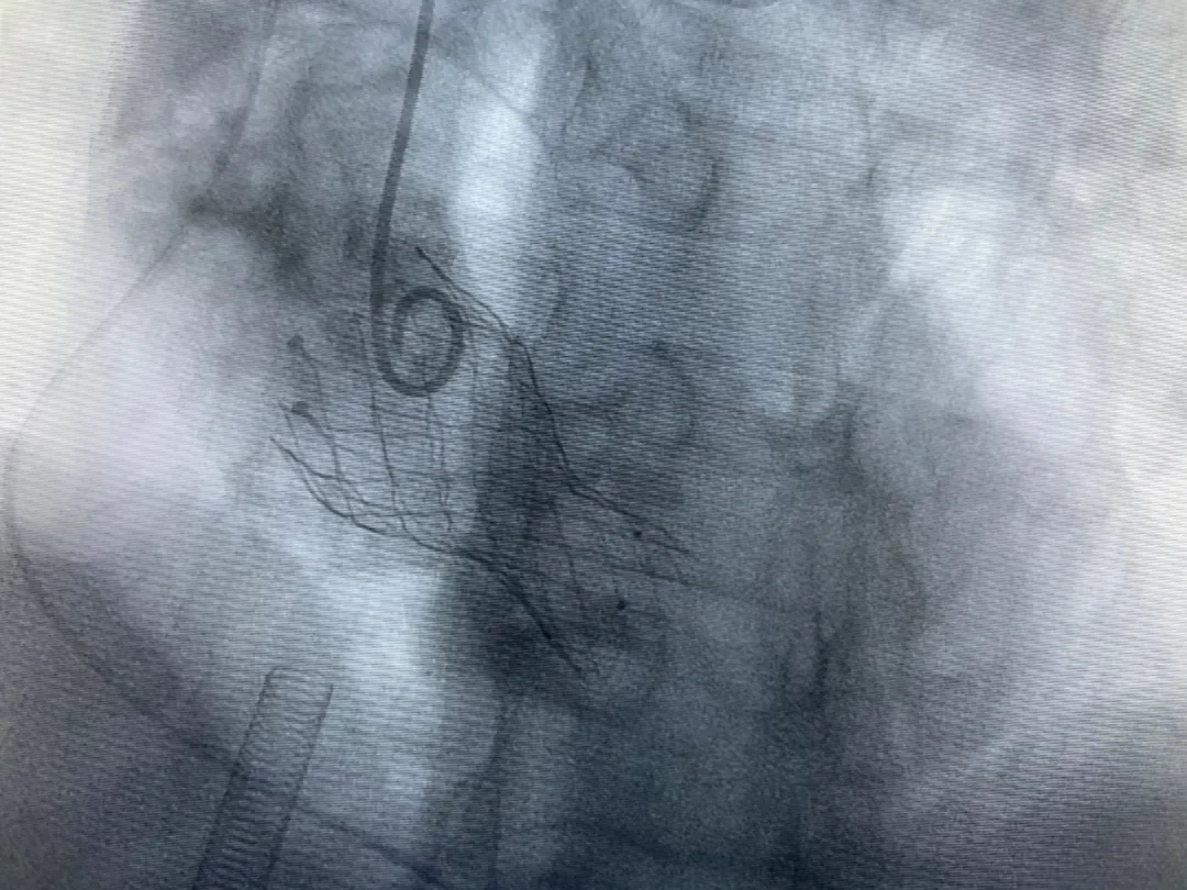 結(jié)合老人病情特點(diǎn):年齡高、室壁厚、左室腔小、瓣膜鈣化嚴(yán)重,術(shù)中球囊擴(kuò)張和瓣膜釋放過程有循環(huán)崩潰可能;為降低此種風(fēng)險(xiǎn)、最大程度提高手術(shù)成功率,張金洲副院長在術(shù)前組織了由楊金保博士帶領(lǐng)的TAVR團(tuán)隊(duì)多次反復(fù)溝通、討論,制定了各種應(yīng)急處理方案。最終經(jīng)過TAVR團(tuán)隊(duì)的默契配合,手術(shù)歷時(shí)2小時(shí),用20#球囊預(yù)擴(kuò)張后順利植入23#主動(dòng)脈瓣生物瓣膜,再次后擴(kuò)后主動(dòng)脈根部造影顯示:人工主動(dòng)脈瓣生物瓣位置良好,瓣葉開閉正常;冠脈顯影良好。經(jīng)食道超聲顯示:主動(dòng)脈瓣葉活動(dòng)度良好,主動(dòng)脈跨瓣壓差約35mmHg,未見瓣周漏及明顯返流。出手術(shù)室前老人便已蘇醒,自訴憋悶癥狀完全消失。