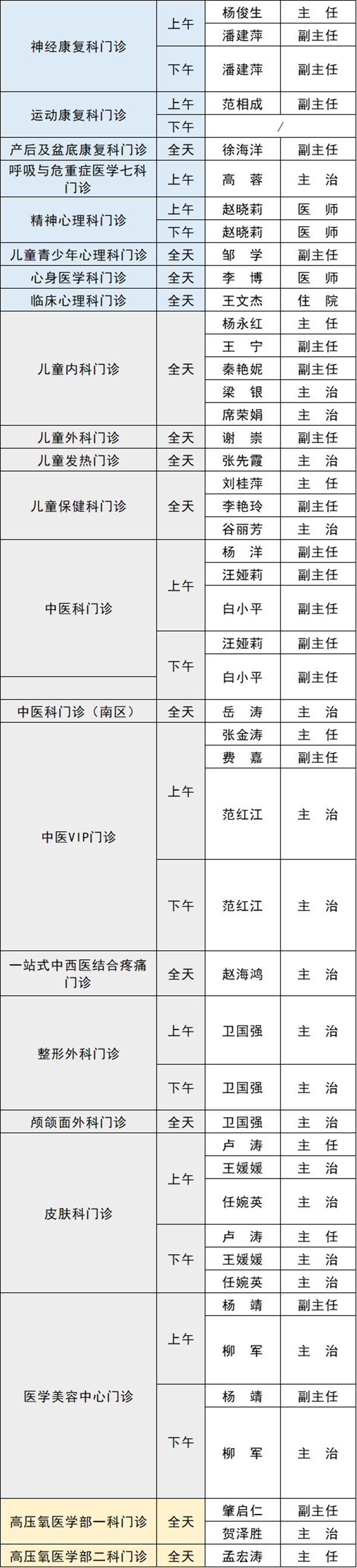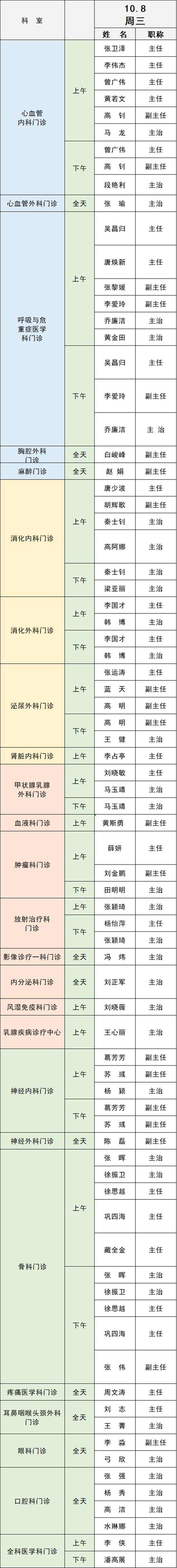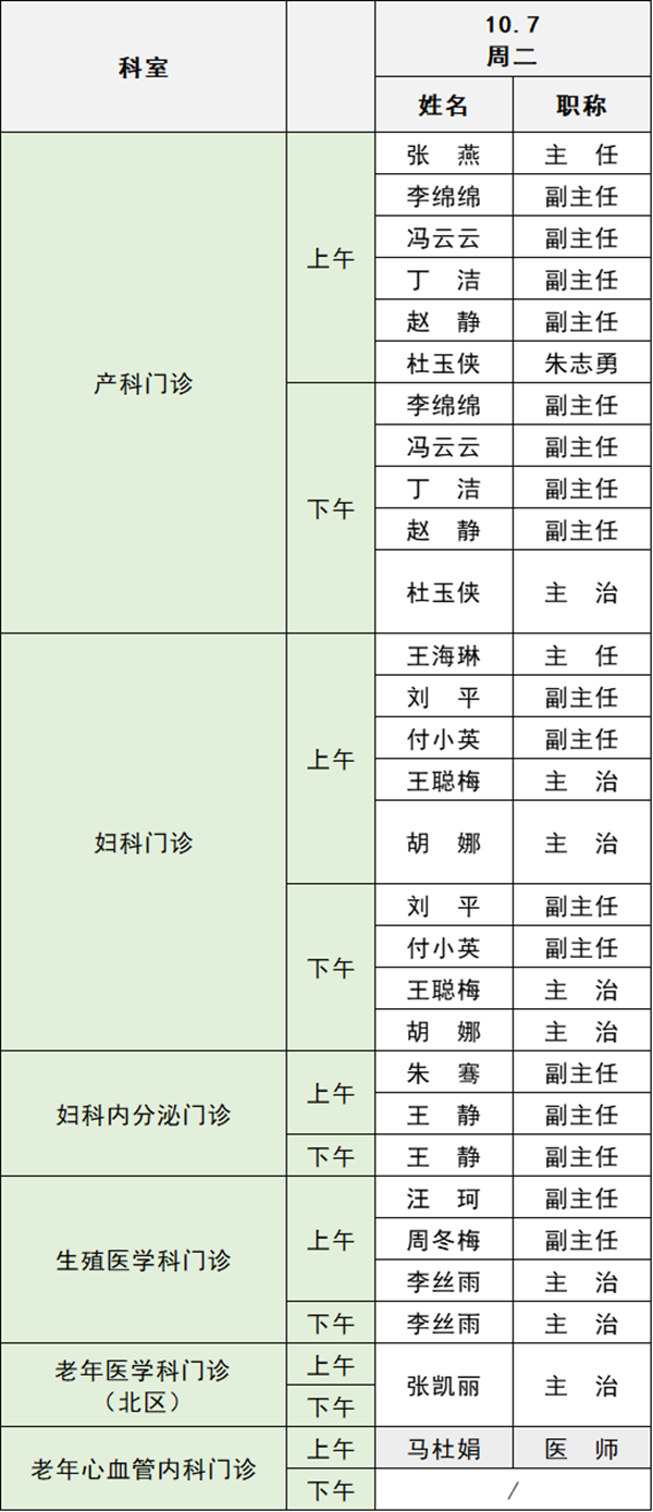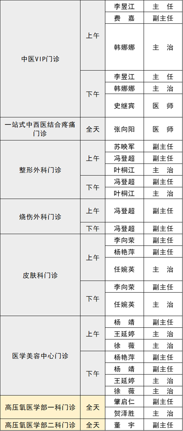 備注:實際出診情況以醫(yī)院掛號平臺實時信息為準。“職稱”欄里主任=主任醫(yī)師副主任=副主任醫(yī)師主治=主治醫(yī)師
