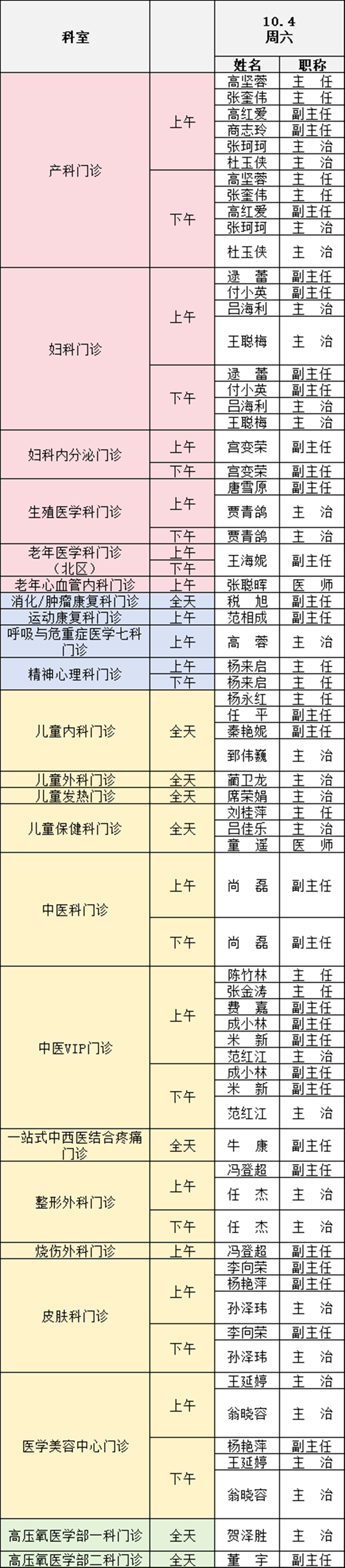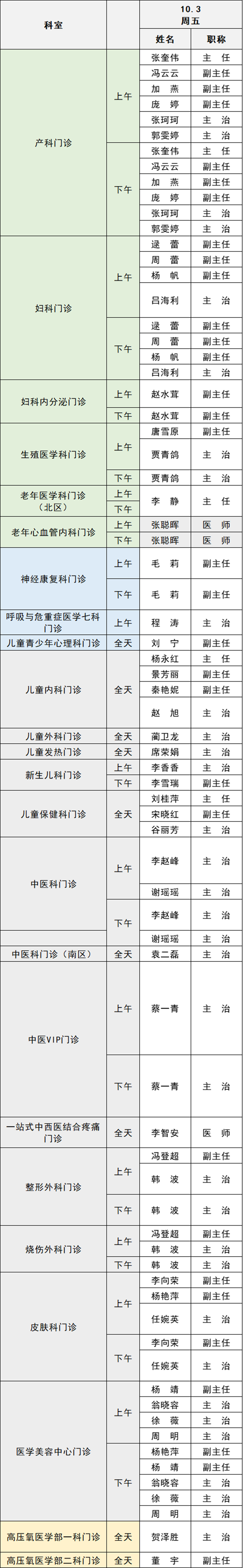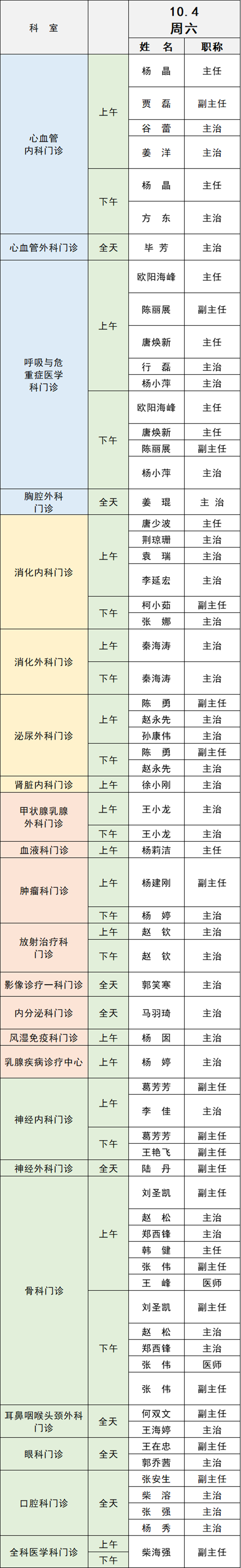 備注:實際出診情況以醫(yī)院掛號平臺實時信息為準。“職稱”欄里主任=主任醫(yī)師副主任=副主任醫(yī)師主治=主治醫(yī)師