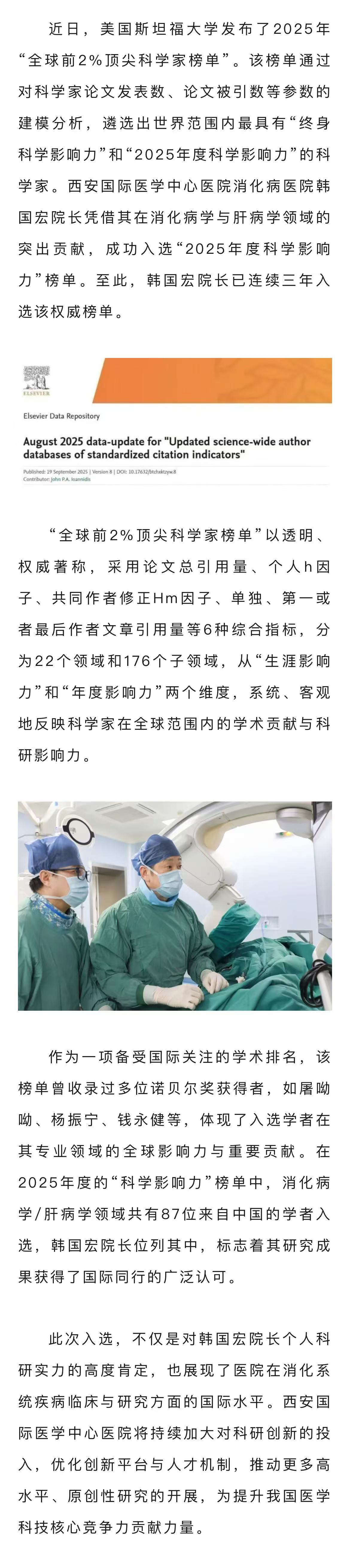 消化病醫(yī)院韓國宏院長入選2025年“全球前2%頂尖科學家榜單”